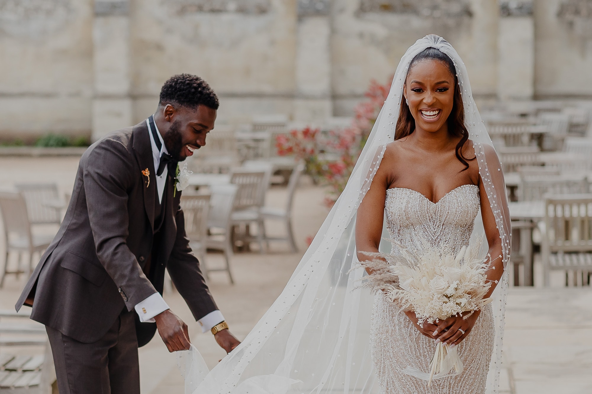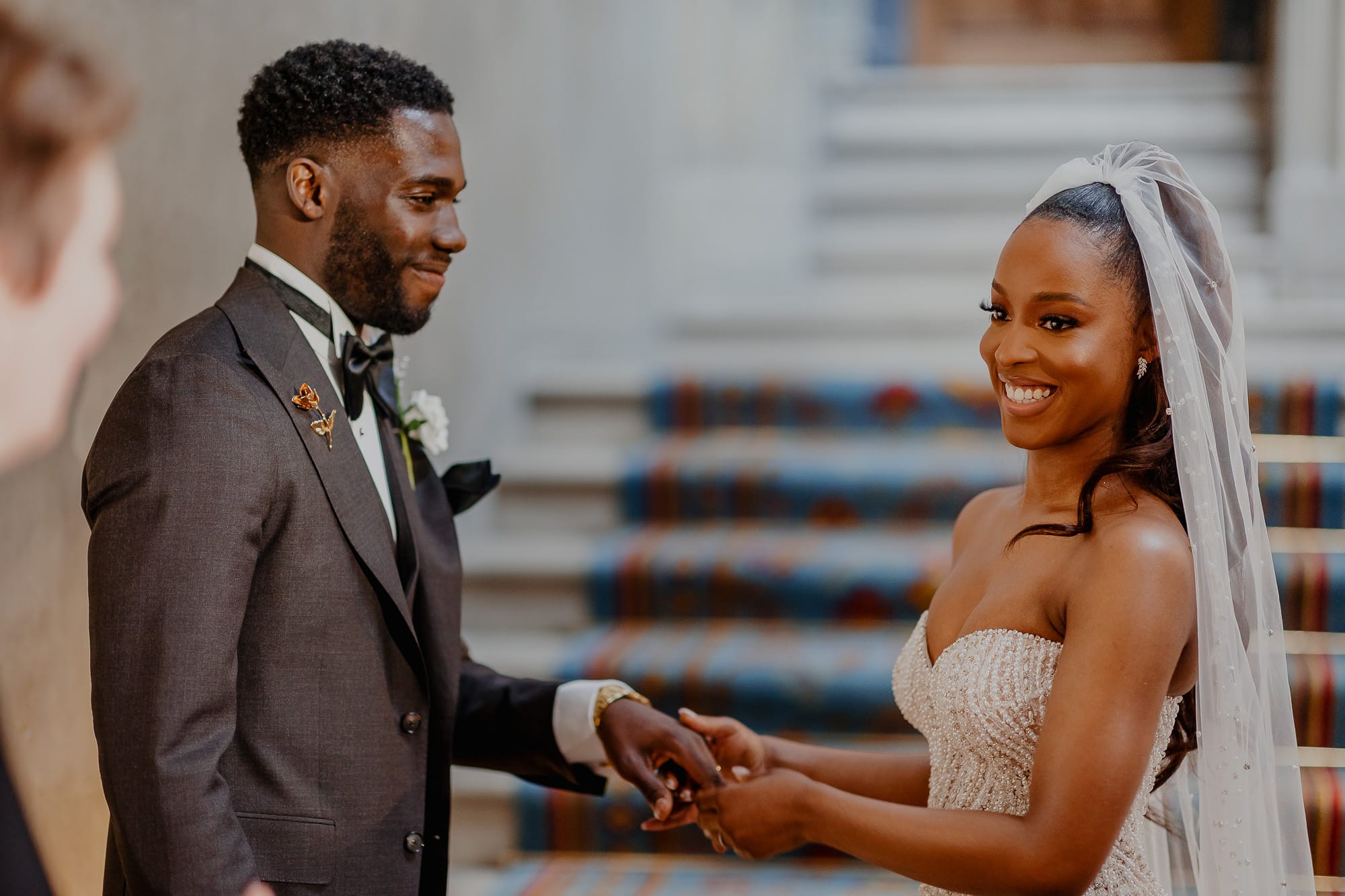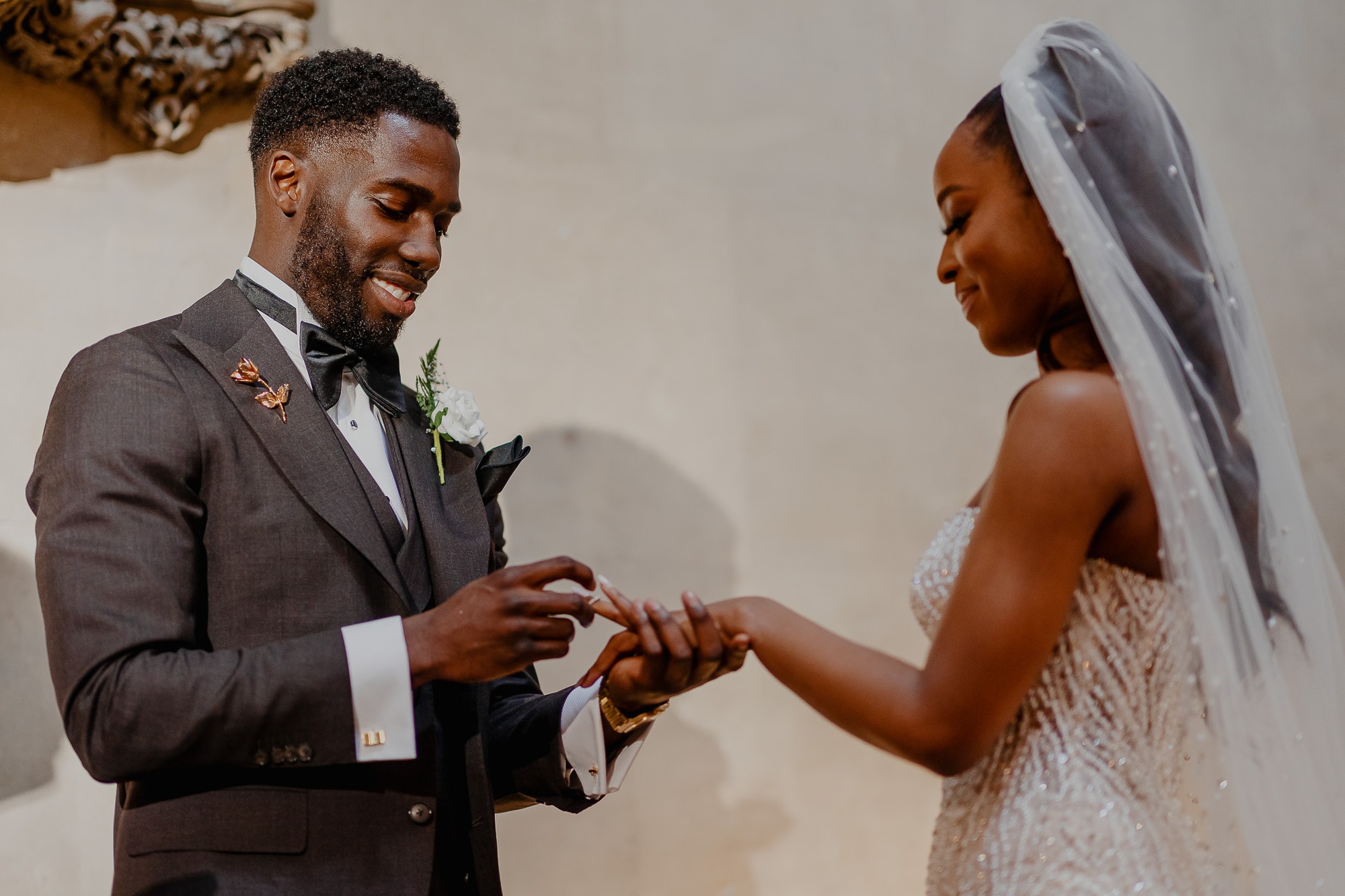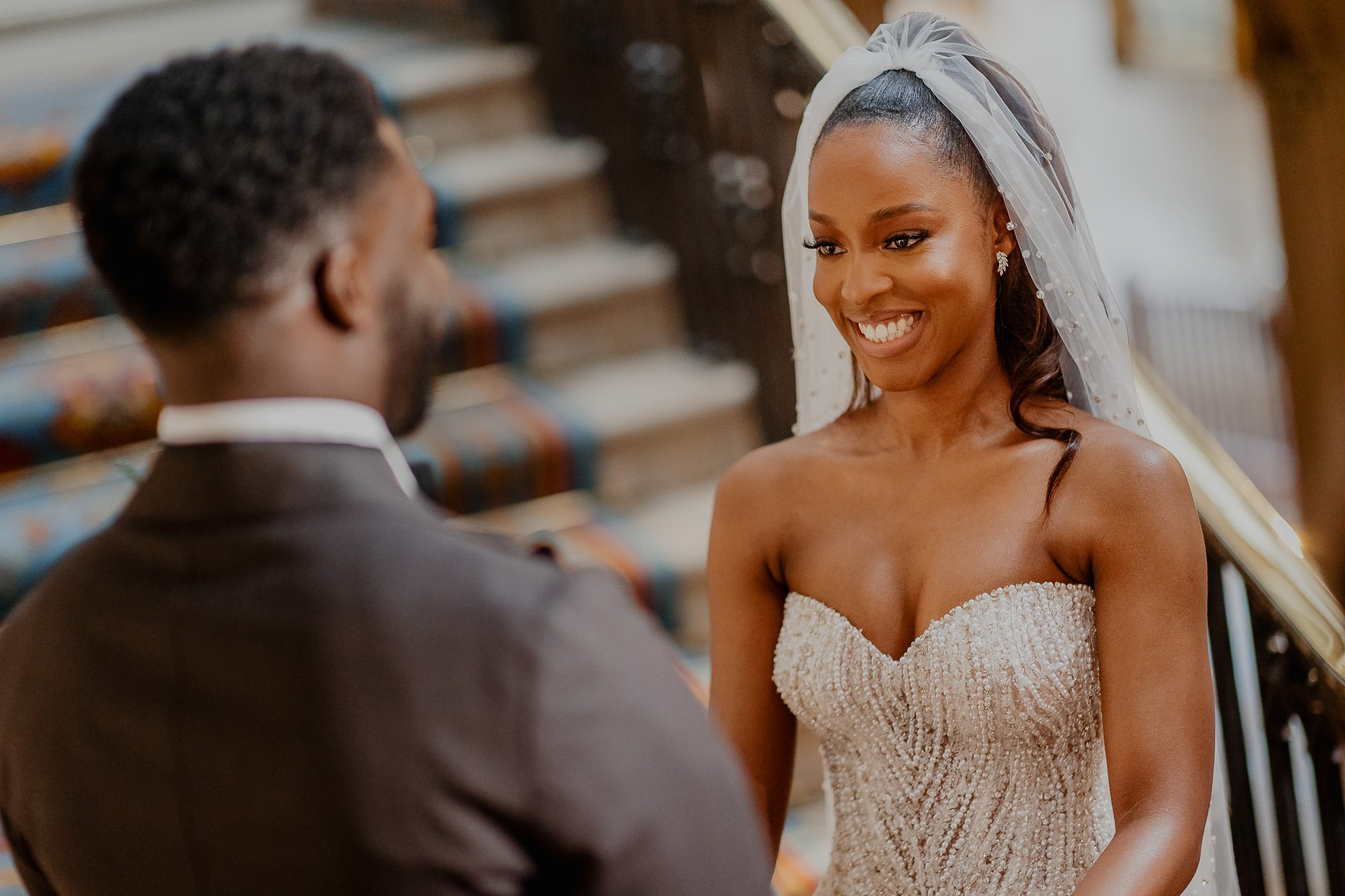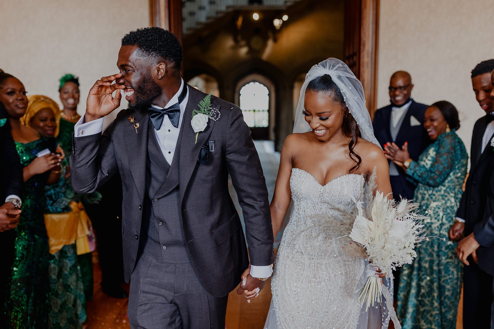 May looked every bit the radiant bride in her bespoke wedding dress, a creation she designed herself and had made abroad. The sparkly ivory-coloured pearl embellished gown accentuated her beauty, adding an ethereal touch to her already captivating presence. As she walked down the famous staircase, Sanmi’s eyes lit up with joy, and it was evident to all that they were destined for a lifetime of happiness together.